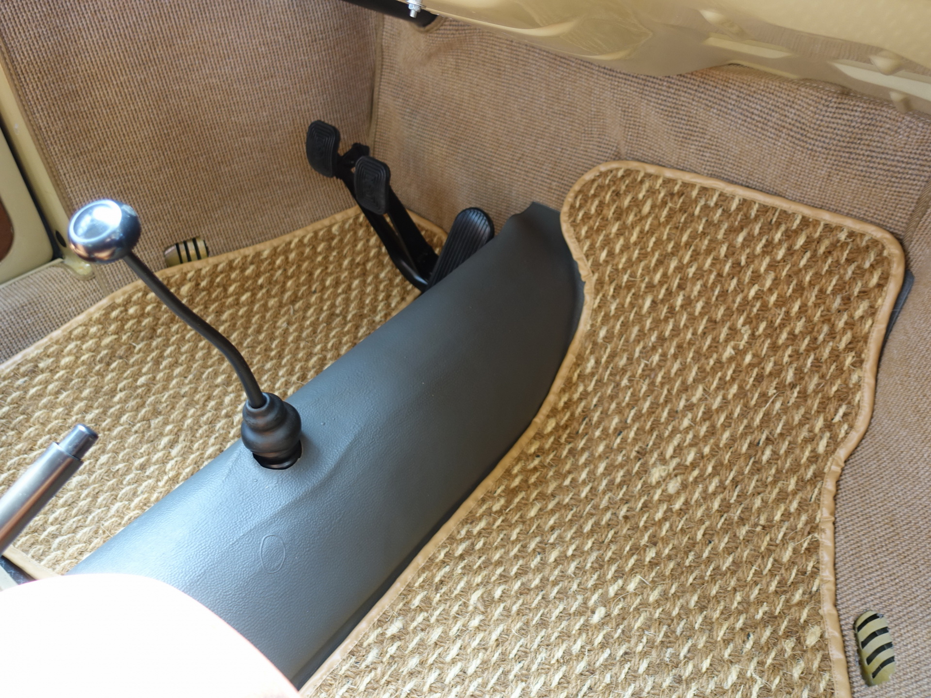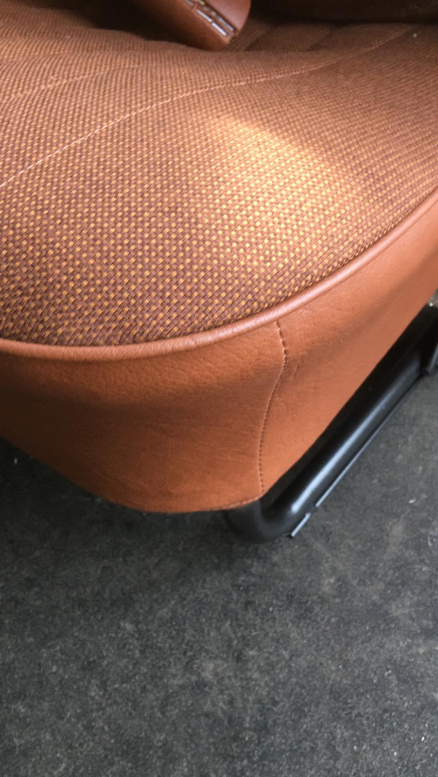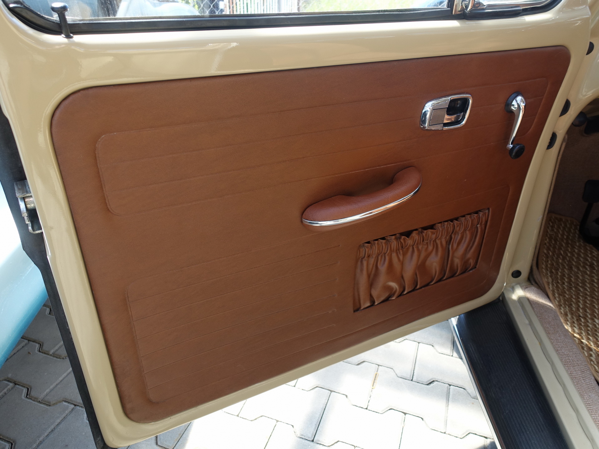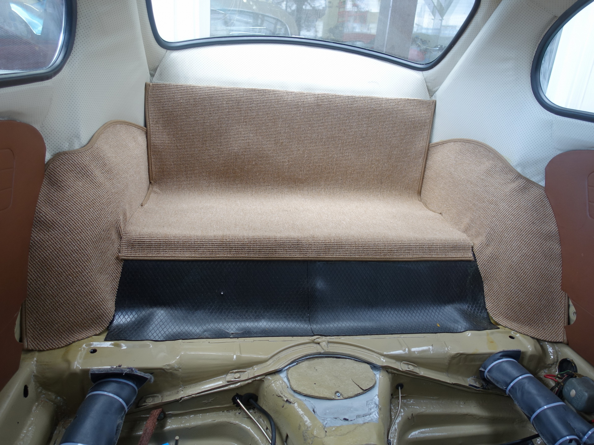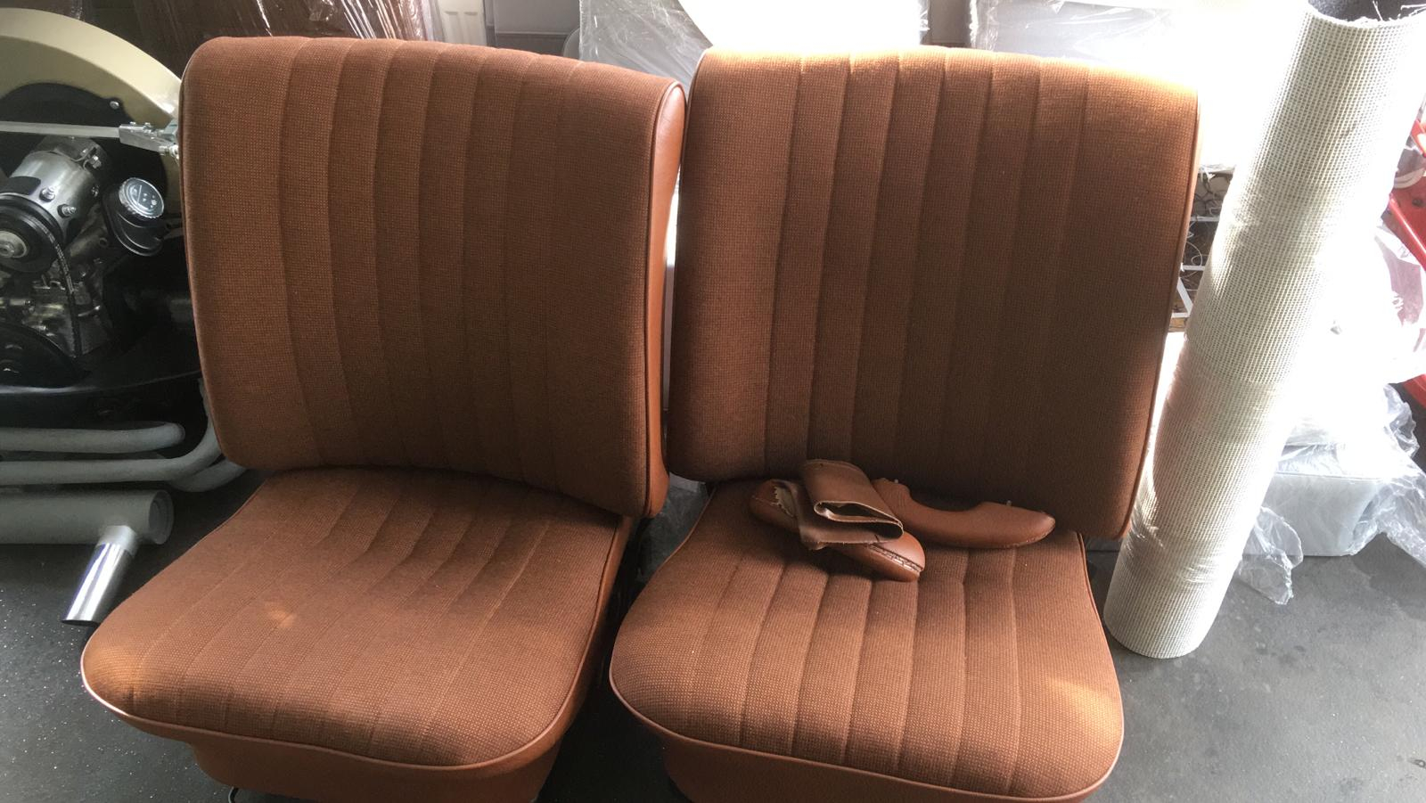Oprava a repase předních a zadních sedadel. Byla vybrána látka a koženka, která se nejvíc blíží k originální látce, která byla na voze z výroby. Nové gumy na podlahu a kokosové koberečky fy Hoffmann.