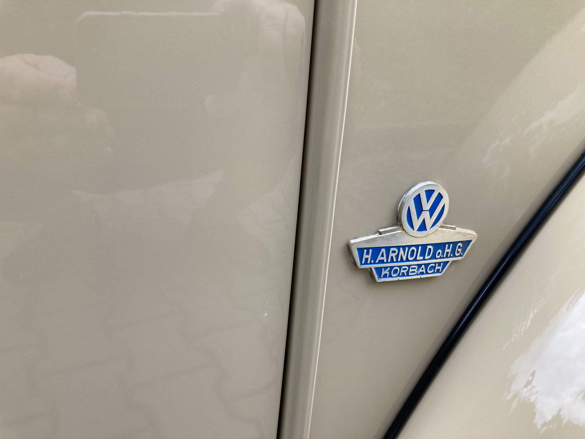 Auto mělo v nálezovém stavu na předním pravém blatníku nalepenu hliníkovou plaketu s emailovaným nápisem: H. ARNOLD o.H.G. KORBACH – viz foto. Plaketa se zachovala a je nalepena na stejném místě. Firma Arnold je prodejní a servisní místo VW, kde byl zřejmě vůz v 70 a 80létech servisován. Firma dodnes existuje pod názvem: Autohaus Heinrich Arnold GmbH & Co KG – Korbach.